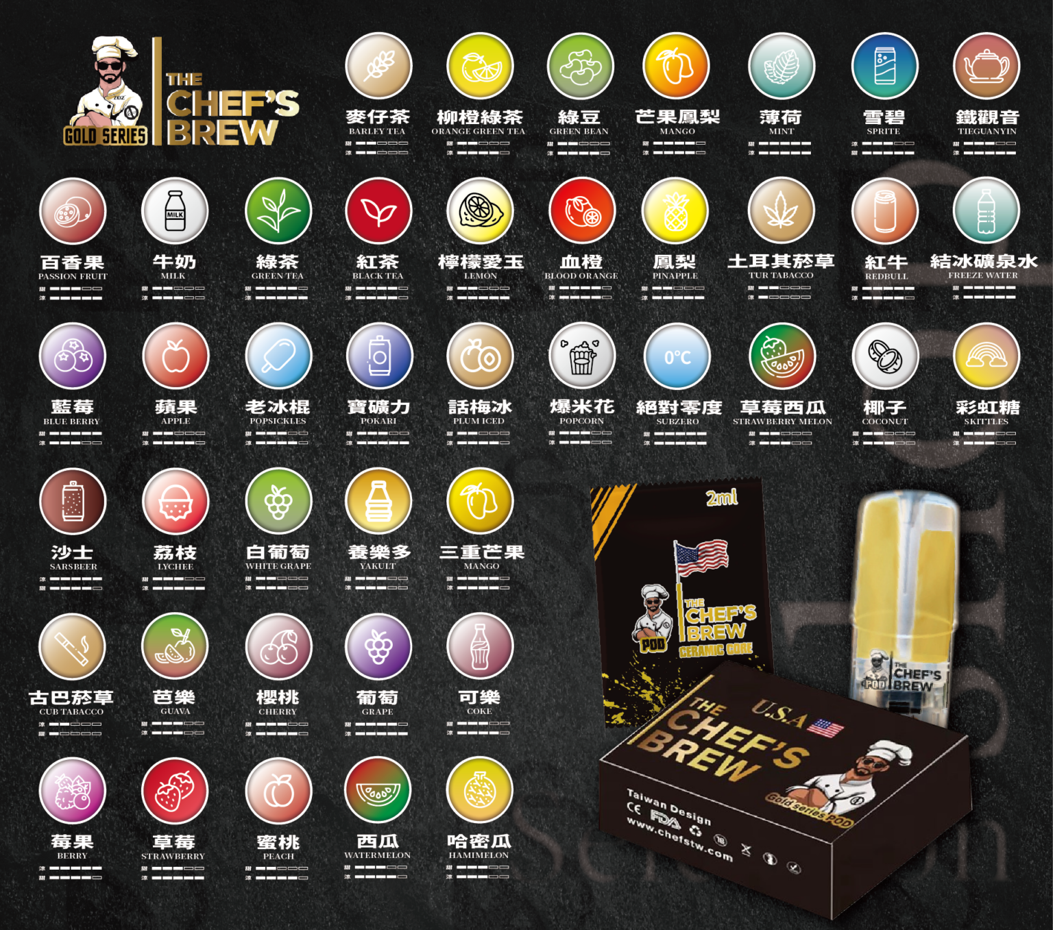 - 通用性強: 廚師佳釀煙彈可通用於各種一代電子煙主機,方便使用者更換不同口味的煙彈。