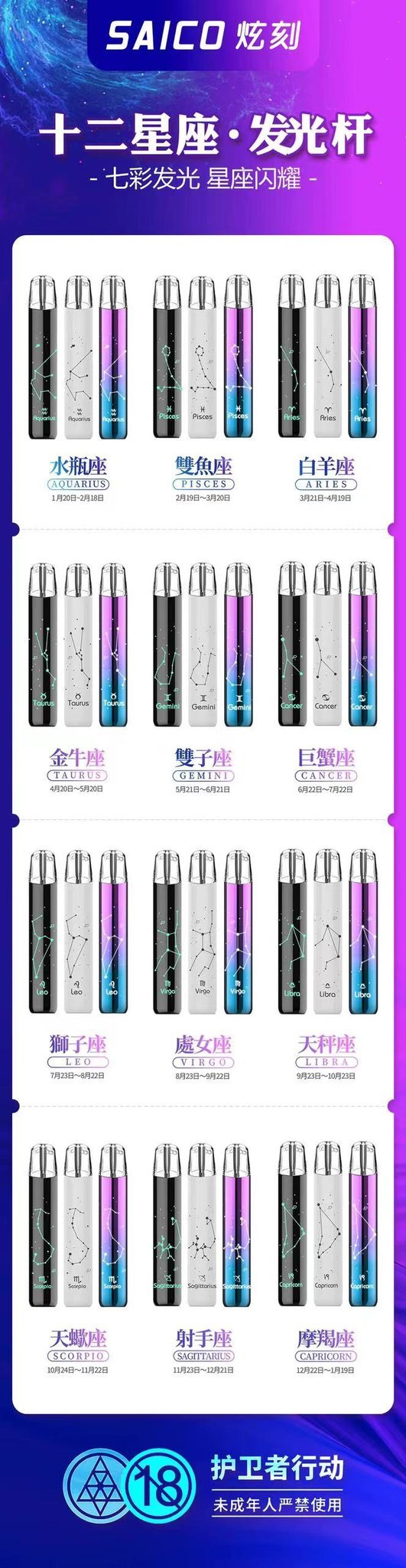 炫刻十二星座霧化桿不僅在外觀設計上獨具匠心,其功能和性能也達到了行業領先水平。無論是時尚的燈光效果、強大的電池續航,還是多重保護功能,Saico主機都能滿足您的需求。如果您喜歡個性化和時尚的電子煙設備,炫刻十二星座霧化桿絕對是一個不錯的選擇。炫刻十二星座煙機不僅滿足了對品質的追求,還兼顧了個性化和實用性。無論是日常使用還是特殊場合,它都能成為您的理想伴侶。快來體驗炫刻十二星座煙桿,感受它帶來的獨特魅力吧!
